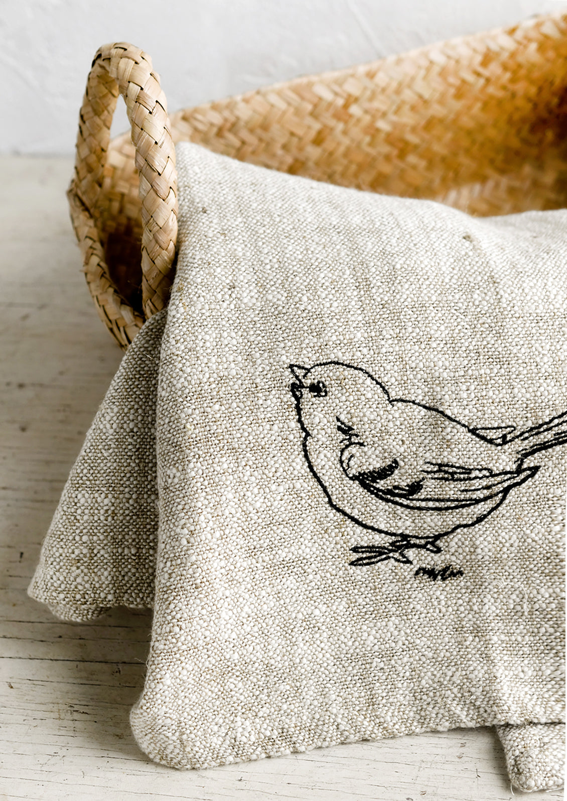 Intricate embroidery gives a touch of whimsy to this natural tea towel — constructed from a thick cotton-linen blend.